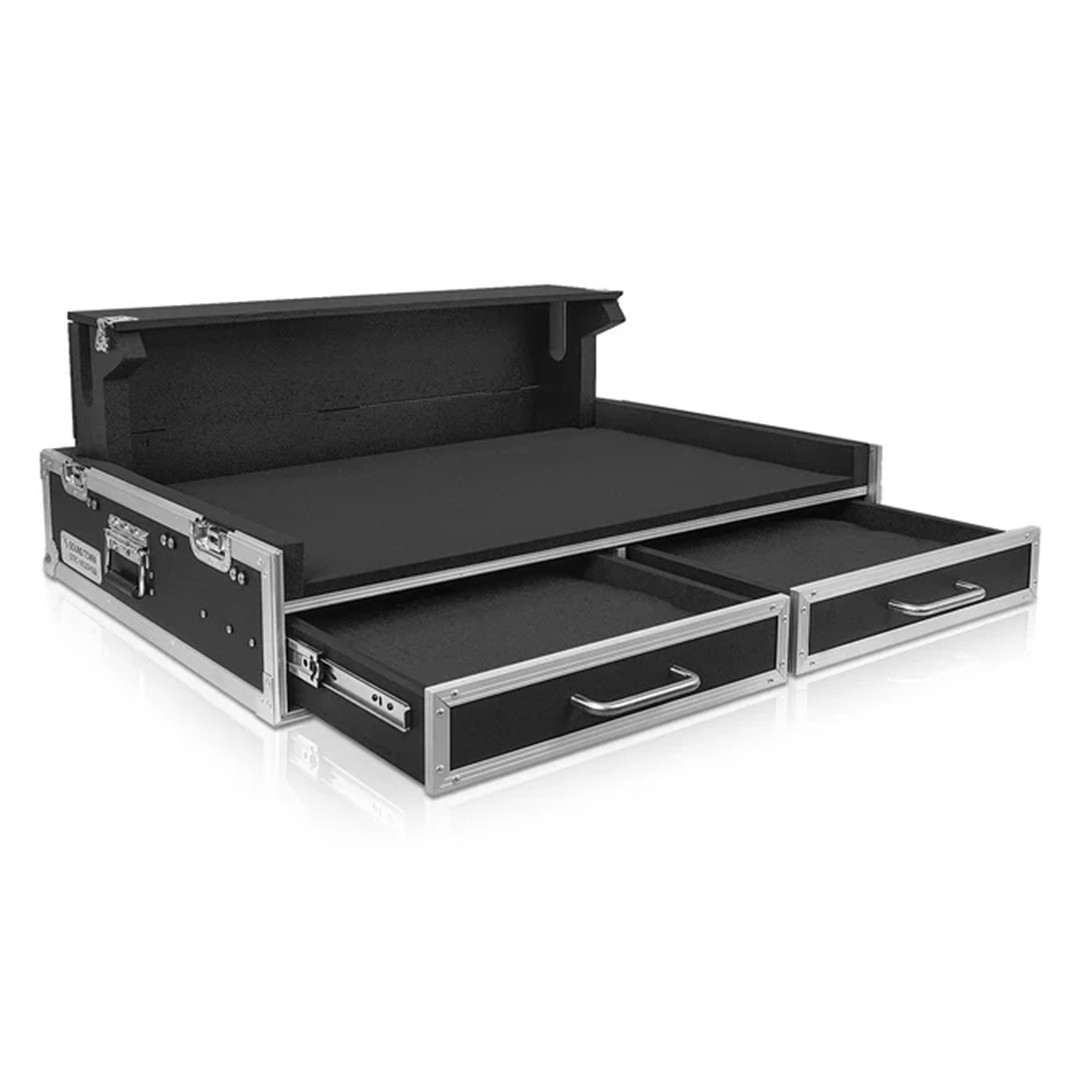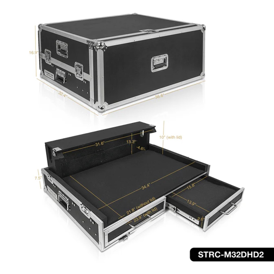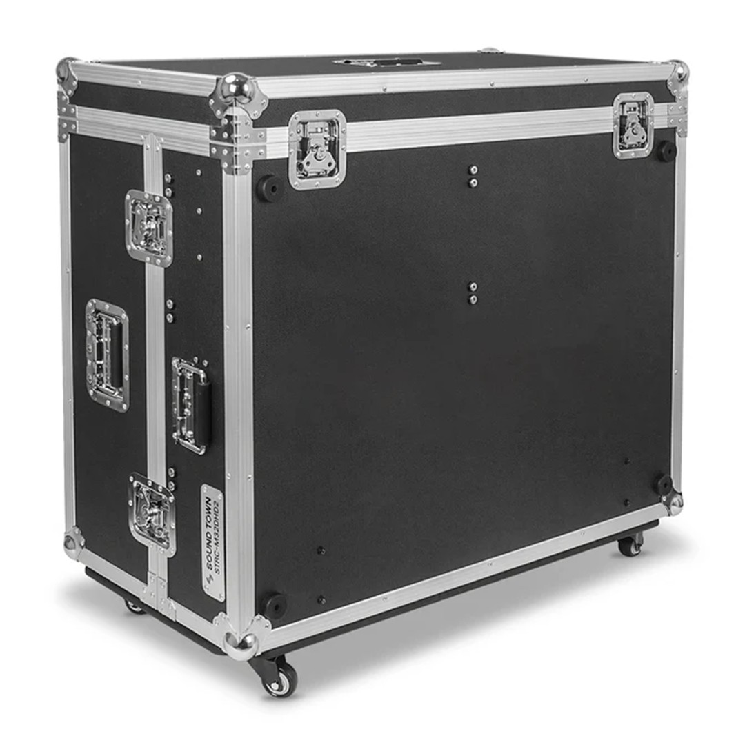 The Sound Town STRC-M32DHD2 mixer case securely fits the Midas M32 digital mixer. It features rugged plywood construction, EVA foam padding, a built-in doghouse for cable management, two storage drawers, and heavy-duty casters with brakes. Ideal for protecting and transporting your mixer on the road or in the studio.