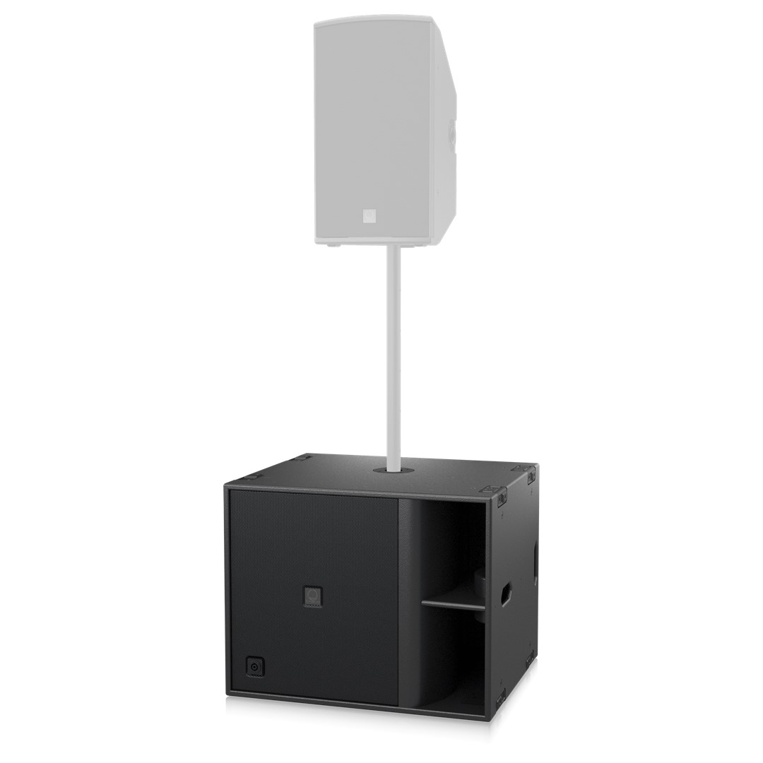 Versatile Setup Options: The subwoofer includes integral feet for secure ground stacking and dual M20 pole mount sockets for satellite speaker configurations. These options enhance setup versatility, allowing for optimal placement in various venues.