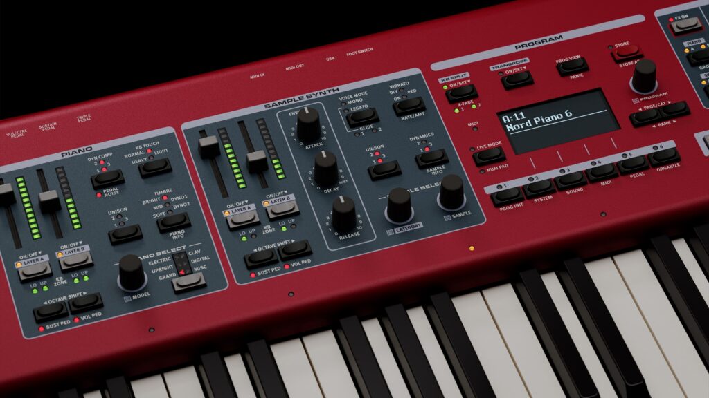 On stage, the first impression is the realism of the acoustic piano sounds. Nord has refined its sample libraries over many years. The Piano 6 delivers delicate shimmer for ballads and powerful projection for full band mixes. Every note responds immediately and naturally. The weighted keybed feels expressive and balanced, capturing grand piano depth while preserving dynamic sensitivity.